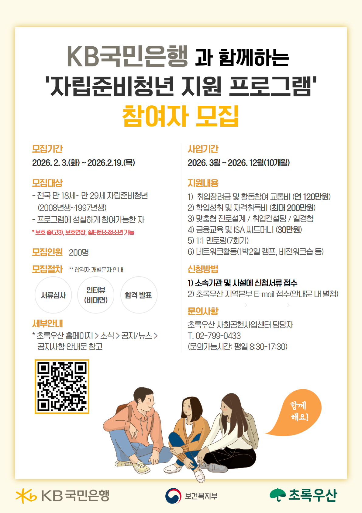 2026 KB±¹¹ÎÀºÇà ÀÚ¸³Áغñû³â Áö¿ø ÇÁ·Î±×·¥ Âü¿©ÀÚ¸¦ ¸ðÁýÇÕ 1. ¸ðÁý´ë»ó : Àü±¹ ÀÚ¸³Áغñû³â(¸¸18-29¼¼) 200¸í - º¸È£Áß(°í3), º¸È£¿¬Àå, º¸È£Á¾·á, ½°ÅÍÅð¼Ò °¡´É 2. Áö¿ø±â°£ : 2026³â 2¿ù ~ 12¿ù 3. Áö¿ø³»¿ë : - Ãë¾÷Àå·Á±Ý 1ÀÎ 120¸¸¿ø - ÀÚ°ÝÃëµæ ¹× Çо÷¼ºÃëºñ 1ÀÎ ÃÖ´ë 200¸¸¿ø - ±ÝÀ¶±³À° ¹× ISA ¾¾µå¸Ó´Ï 30¸¸¿ø - ¸ÂÃãÇü Áø·Î¼³°è(Áø·Î°Ë»ç ¹× 1:1ÄÁ¼³ÆÃ) - Ãë¾÷ÄÁ¼³ÆÃ ¹× ÀϰæÇè ÇÁ·Î±×·¥(±³À°ÈƷúñ Áö¿ø) - Àü¹®ÄÚÄ¡ 1:1 ¸àÅ丵 - ¹ß´ë½Ä, ³×Æ®¿öÅ©(Ä·ÇÁ, ¿öÅ©¼ó µî) - ¼º°ú°øÀ¯È¸ 4. ¸ðÁý±â°£ : 2026.2.3.(È)~2026.2.19.(¸ñ)