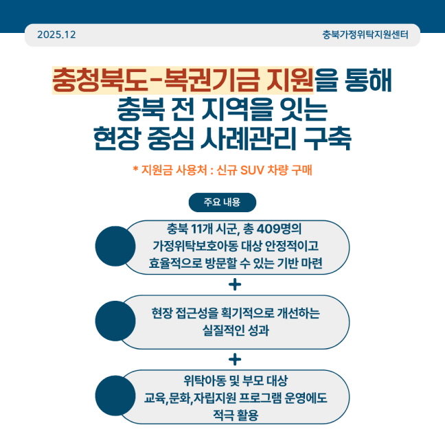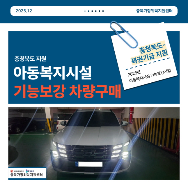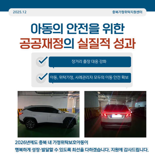 ÃæºÏ°¡Á¤À§Å¹Áö¿ø¼¾ÅÍ¿¡¼´Â ÃæÃ»ºÏµµ¿Í º¹±Ç±â±Ý Áö¿øÀ¸·Î¡¸2025³â ¾Æµ¿º¹Áö½Ã¼³ ±â´Éº¸°»ç¾÷¡¹À» ÅëÇØ ½Å±Ô ±â°ü Â÷·®(SUV) ±¸¸Å¸¦ ¿Ï·áÇÏ¿´½À´Ï´Ù. ½Å±Ô Â÷·® ±¸ÀÔÀ» ÅëÇØ ÃæºÏ 11°³ ½Ã¡¤±ºÀÇ °¡Á¤À§Å¹º¸È£¾Æµ¿ 409¸íÀ» À§ÇÑ ÇöÀå Á᫐ »ç·Ê°ü¸®¿Í ¾Æµ¿ ¾ÈÀü Áö¿øÀÌ ÇÑÃþ °ÈµÉ °ÍÀ¸·Î ±â´ëµË´Ï´Ù.